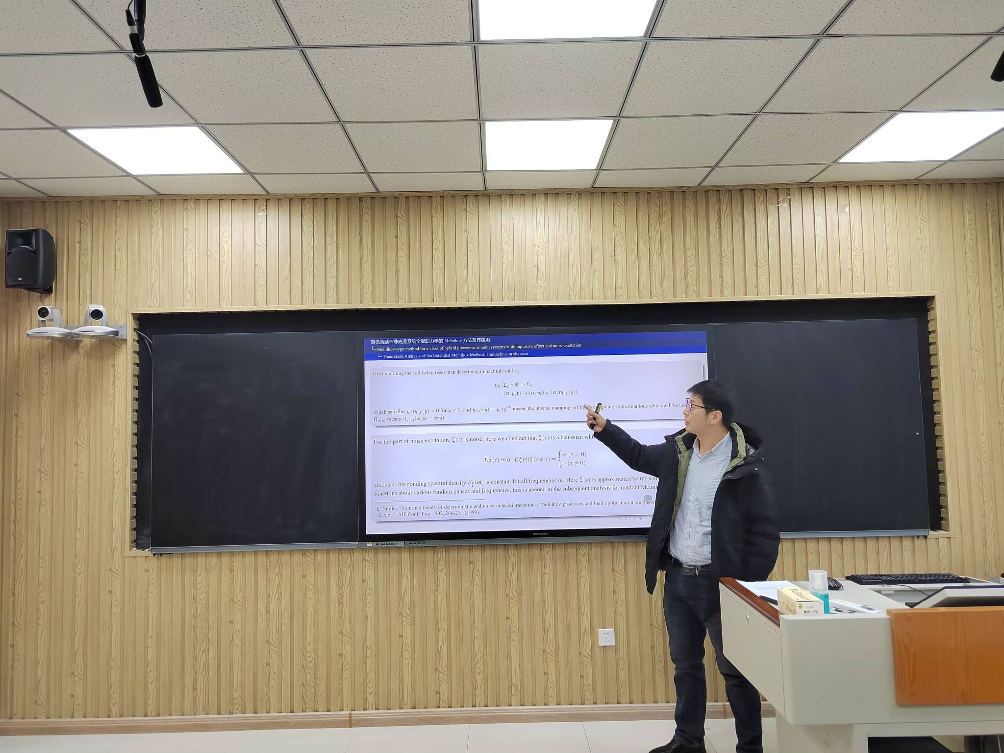 报告会上,魏教授首先介绍了经典同宿与异宿Melnikov方法,然后将两种方法在具有脉冲效应和噪声激励的混合分段光滑系统中的推广作了介绍,结合上述两种方法发展了相应全局分岔与混沌动力学的随机非光滑Melnikov理论,探究了其混沌产生准则与机理,并将上述理论结果应用于分析一个具有碰撞、干摩擦和环境噪声激励的复杂非光滑机械系统动力学模型,探究了与船舶横摇、混沌倾覆与抑制等相关问题。最后,魏周超教授热情地回答了师生们提出的问题。此次报告开拓了研究生的学术视野,提高了学生从事科学研究的积极性。