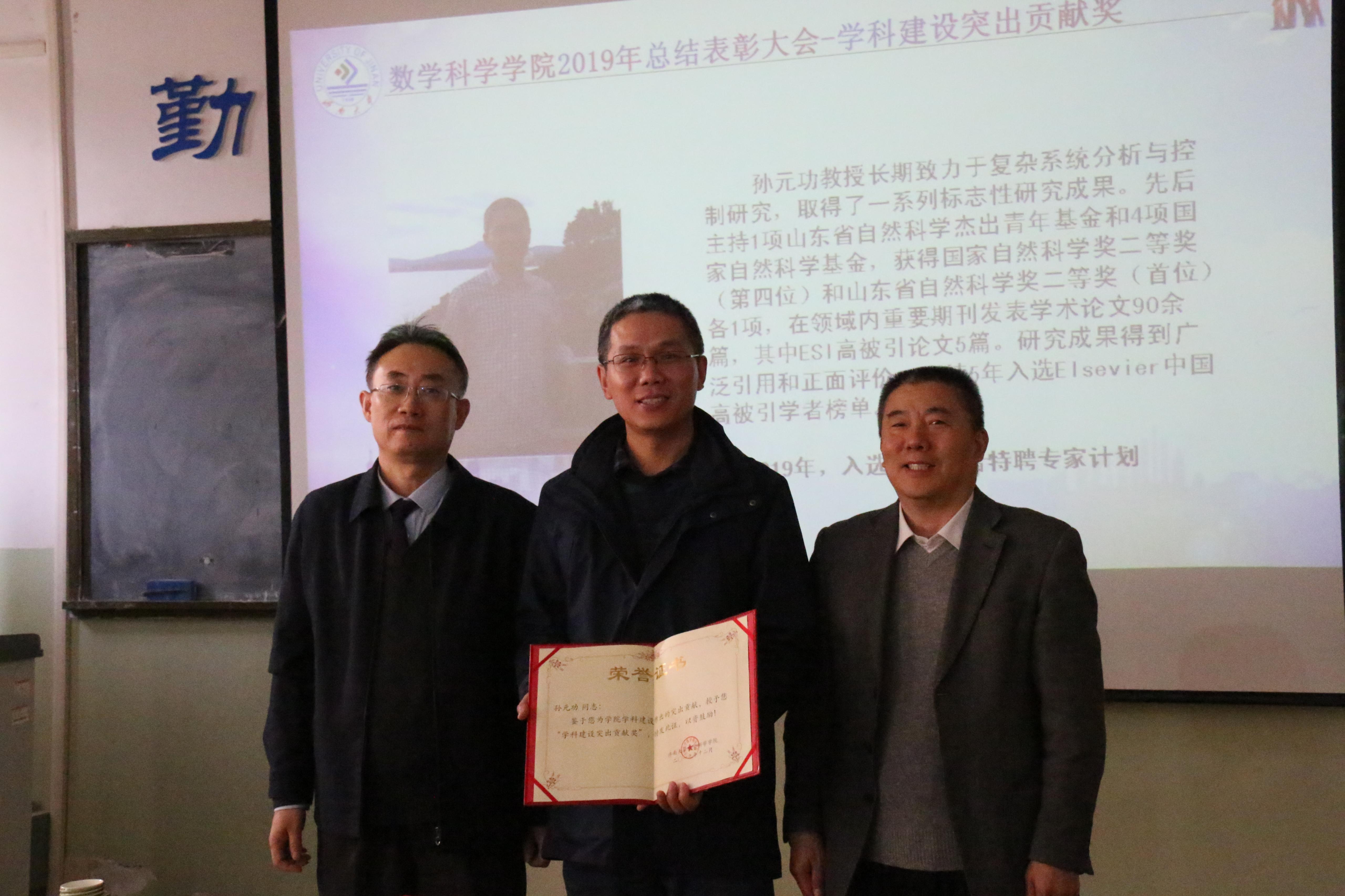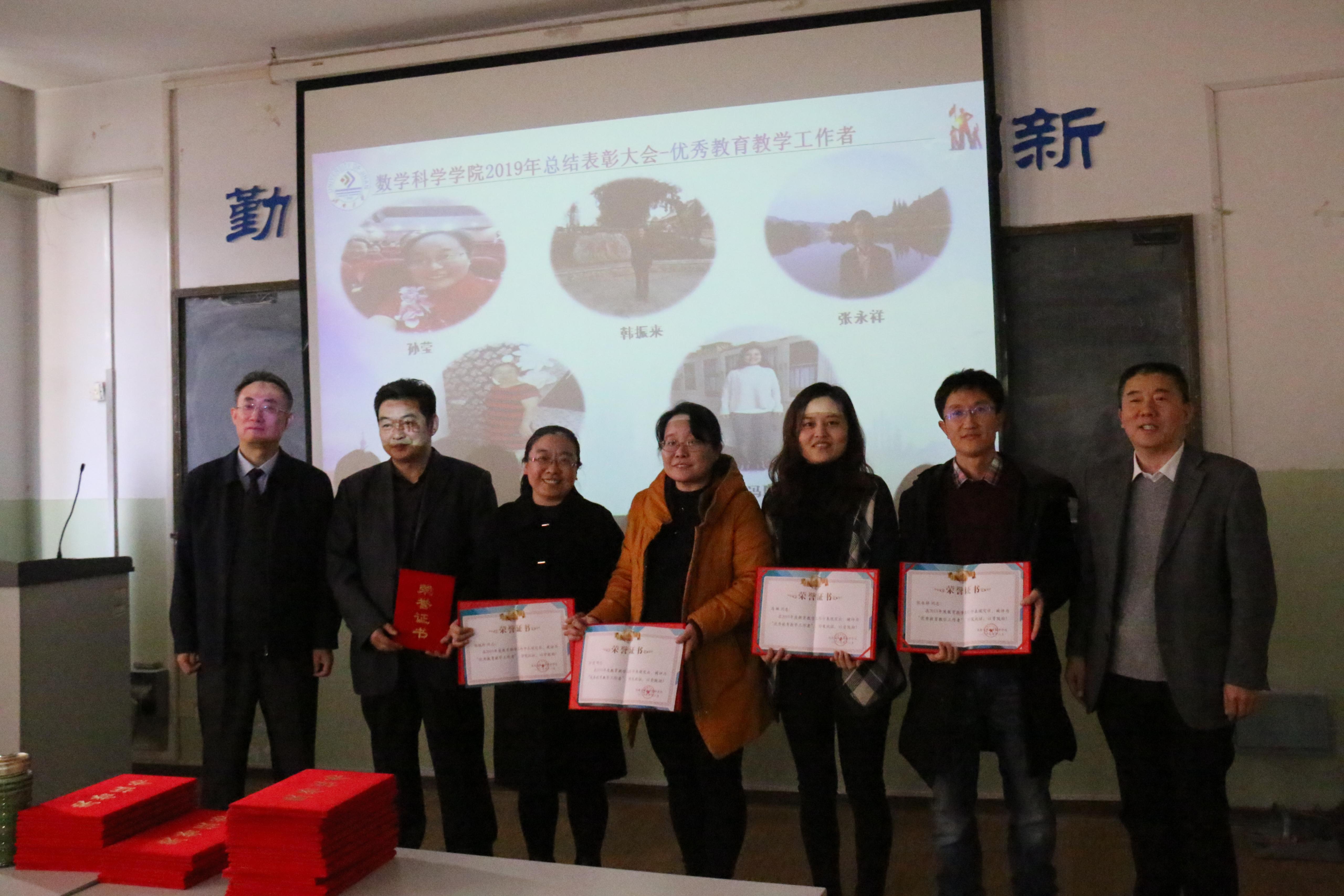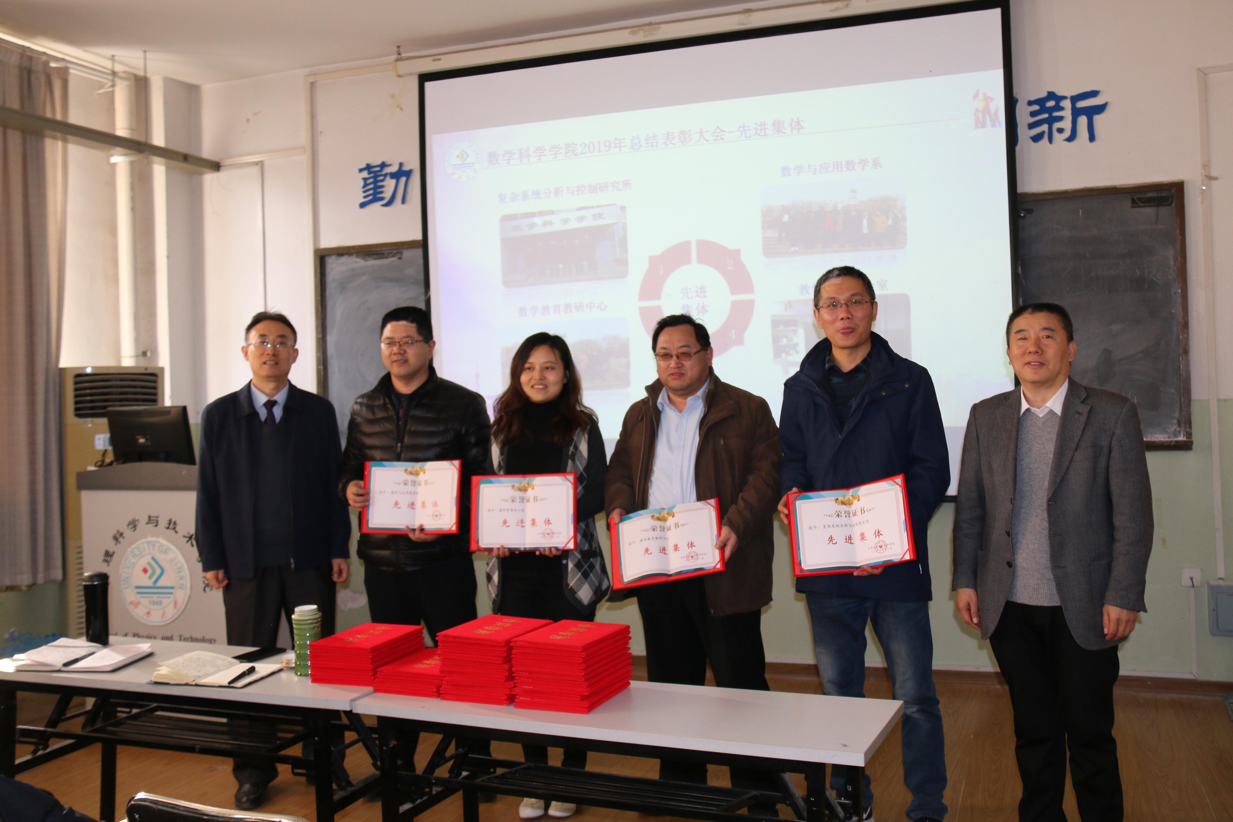 孙元功荣获学院学科建设突出贡献奖,孟德洋、赵华磊荣获学生科创突破奖,张苏梅、孙书荣、李可峰、陈兆英、刘春燕、张超、孙莹、韩振来、张永祥、郑艳玲、冯琳荣获 “优秀教育教学工作者”称号,孙元功、张永祥、陈观伟、刘红军、孙书荣、邵长国、赵以阁、杨健、宗雯雯、张志强、束彦军荣获“优秀科研工作者”称号,孙莹、赵华磊、赵以阁、孙钏峰荣获优秀班主任,吴立军、马巧灵、陈兆英、孙莹、刘艳、郝志峰、张颖荣获工会活动积极分子,复杂系统分析与控制研究所、数学与应用数学系、数学教育教研中心、教学管理办公室荣获“先进集体”称号。