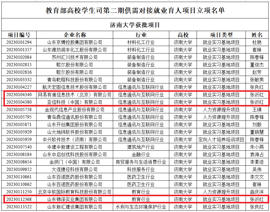 近日,教育部公布了第二期供需对接就业育人项目名单。学院3个就业实习基地育人项目获批立项。学院在教育部第一期供需对接就业育人项目中获批立项2个,两期累计获批5个供需对接就业育人项目。