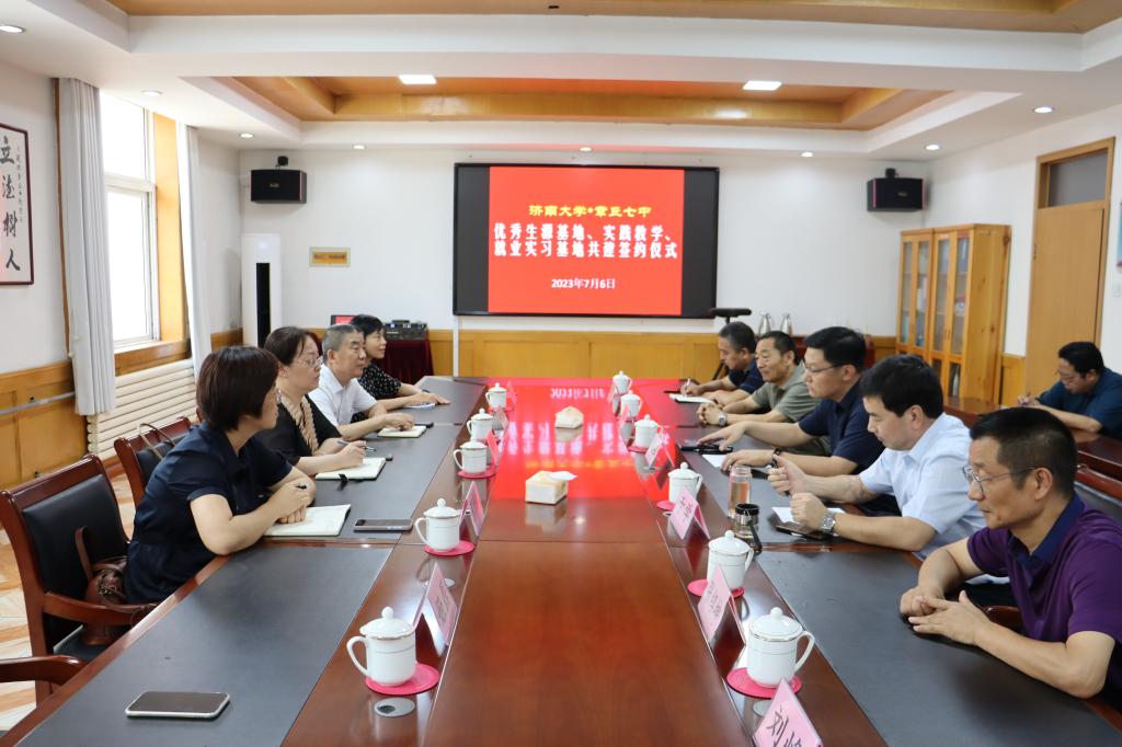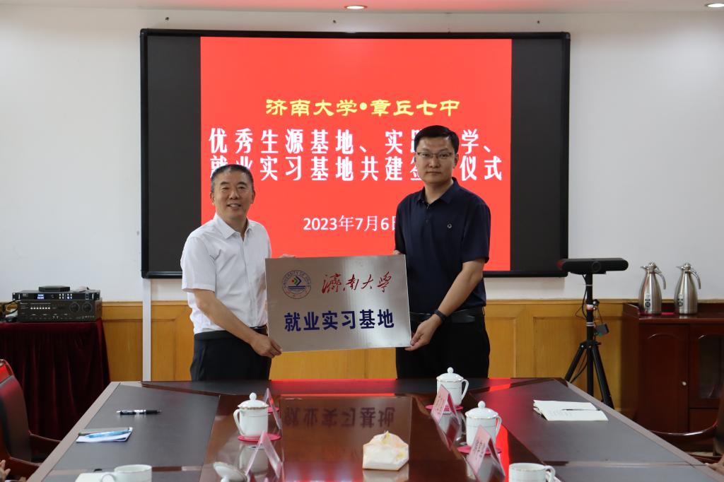 与章丘第七中学签订了优秀生源基地、实践教学基地、就业实习基地协议,并举行了授牌仪式。