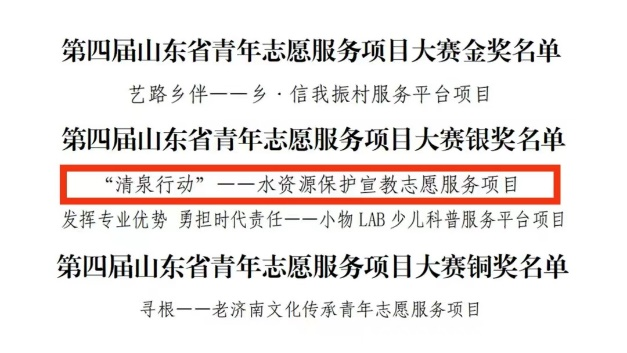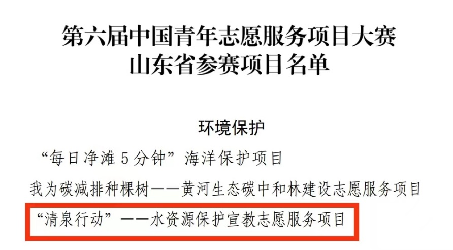 于洋老师指导的“‘清泉行动’——水资源保护宣教志愿服务项目”在第四届山东省青年志愿服务项目大赛获得银奖,并于近日接到通知,该项目被山东省青年志愿者协会推荐参加第六届中国青年志愿服务项目大赛。