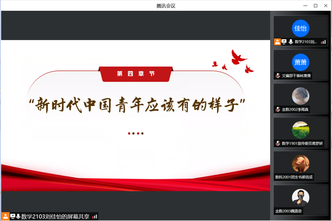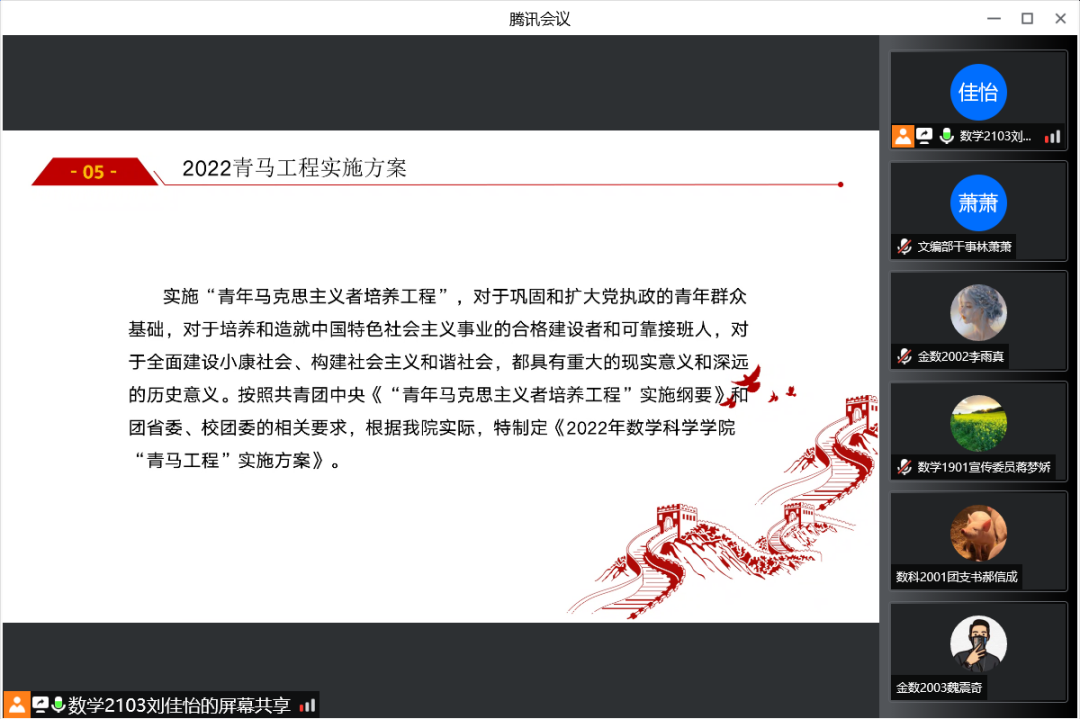 会议伊始,主讲人数学2103班刘佳怡同学向大家介绍了“2022年青马班实施方案”。随后,大家共同学习了习近平总书记在庆祝中国共产主义青年团成立100周年大会上重要讲话精神,号召青年团员要时刻牢记习近平总书记的殷殷嘱托,坚定不移听党话、跟党走,努力成长为堪当民族复兴重任的时代新人。为不断巩固拓展党史学习教育成果,同学们观看了讲述党的百年光辉历程的视频资料,共同感受百年来中国共产党团结带领人民不断为美好生活而奋斗的壮丽篇章。会议最后,主讲人鼓励青马班成员以青马班为契机,加强理论知识学习,提升政治素养;积极参与青鸟返乡计划、暑期三下乡等活动,以实际行动践行新时代青年的责任与担当。