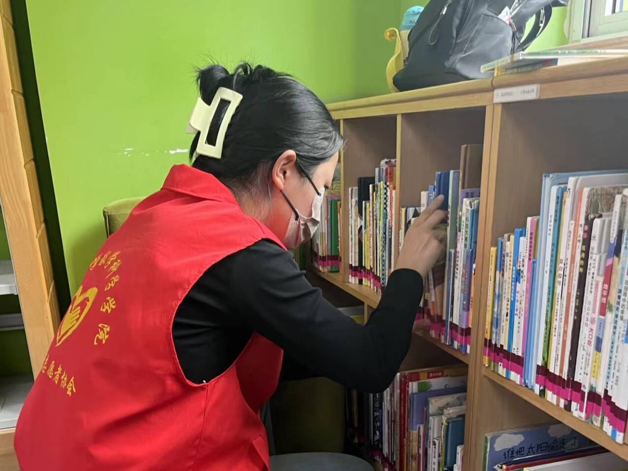 志愿者们刚刚到达图书馆,馆内就已经有很多小朋友已经开始阅读。书香浓郁,闲静致远,馆内拥有大量的藏书,用颜色区分开各类图书以方便读者查阅借记,志愿者们协助馆内工作人员整理图书,将借出收回的书籍按各颜色摆放在相应的书架上。随着馆内读者的越来越多,志愿者们帮助读者在自助查阅机上寻找目标书籍,对应找到相应书架。很多低年级的小读者在志愿者的帮助下阅读名著,感受文字的魅力,沉浸在宁静安逸的读书环境中,遨游在知识的海洋里。