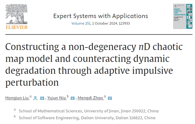 1. 题为“Constructing a non-degeneracy nD chaotic map model and counteracting dynamic degradation through adaptive impulsive perturbation”的研究论文(//doi.org/10.1016/j.eswa.2024.124238),刘红军副教授为第一作者和通讯作者,大连大学牛玉军副教授为第二作者,研究生赵梦迪为第三作者。