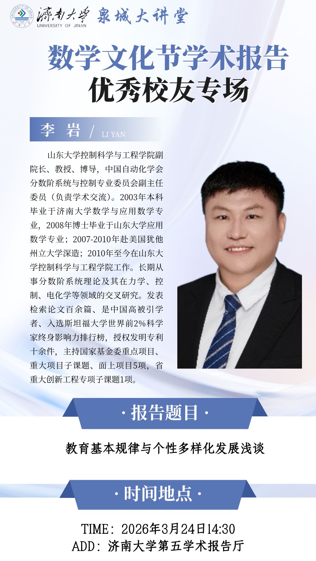 泉城大讲堂·91福利 第二届数学文化节学术报告:教育基本规律与个性多样化发展浅谈