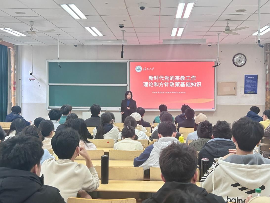 在第十教学楼104室举行新时代党的宗教工作理论和方针政策专题宣讲活动。学校党委统战部副部长刘鑫出席并做专题宣讲,学院党委书记崔英静,党委副书记、副院长张沂红及部分学生党员、入党积极分子共计100余人参加活动。